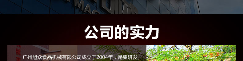 廣州旭眾食品機(jī)械有限公司是一家集科研開發(fā),生產(chǎn)設(shè)計,營銷服務(wù)為一體的現(xiàn)代化生產(chǎn)企業(yè)?,F(xiàn)代化生產(chǎn)車間,精湛制造技術(shù),所產(chǎn)機(jī)械歷經(jīng)市場重重考驗,不斷贏得海內(nèi)外客戶的贊譽(yù)。